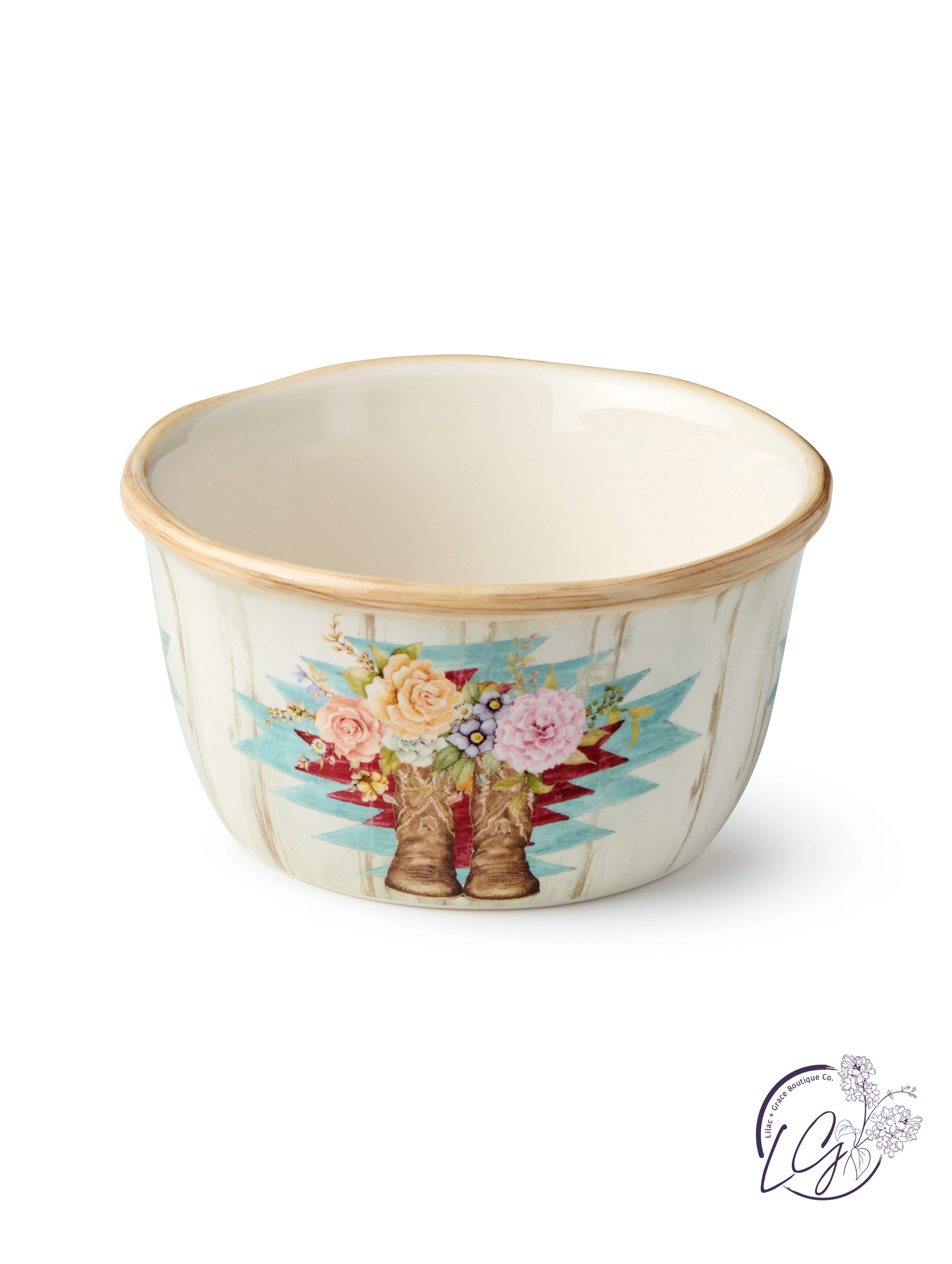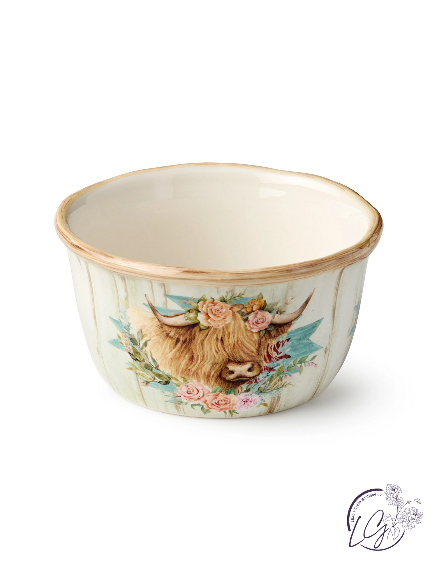 Bring a touch of rustic elegance to your dessert table with the Rosewood Ranch Ice Cream Bowl Set, a delightful collection of four unique designs that celebrate country living. Each 5.25" x 3" bowl features charming artwork, including a floral bouquet in cowboy boots, a Highland cow adorned with roses, a cowboy hat with a lasso surrounded by flowers, and a Southwestern-inspired steer skull. Perfectly sized for serving ice cream, sorbet, or yogurt, these bowls are versatile enough for side dishes like dips, sauces, or small salads.