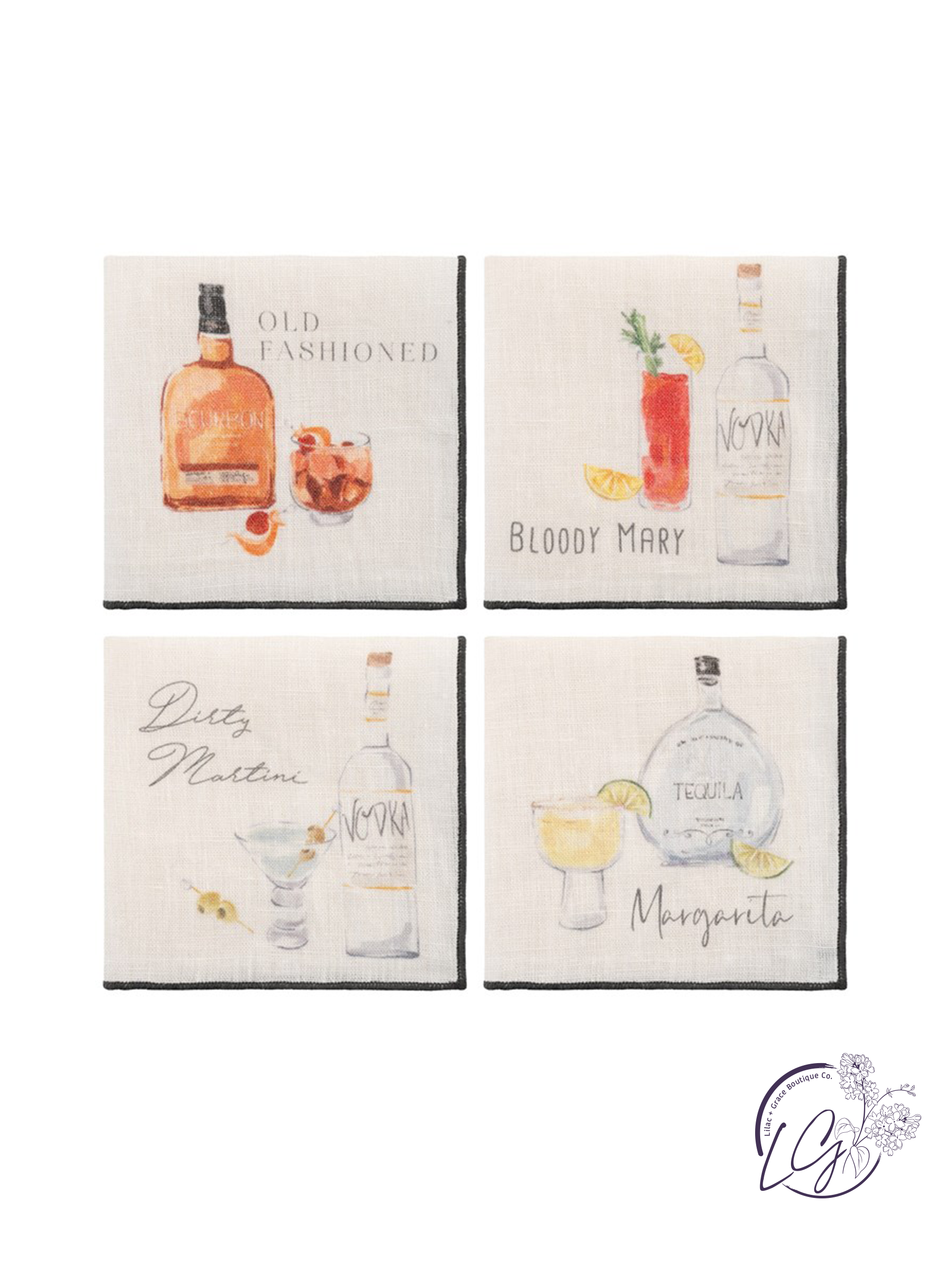 Soft linen lays the foundation for these cocktail napkins. From special gatherings to everyday, these speakeasy napkins will bring your experience to the next level with their elegant look. Featuring 4 chic designs, these napkins are sure to bring a tailored vibe to your cocktail hour.