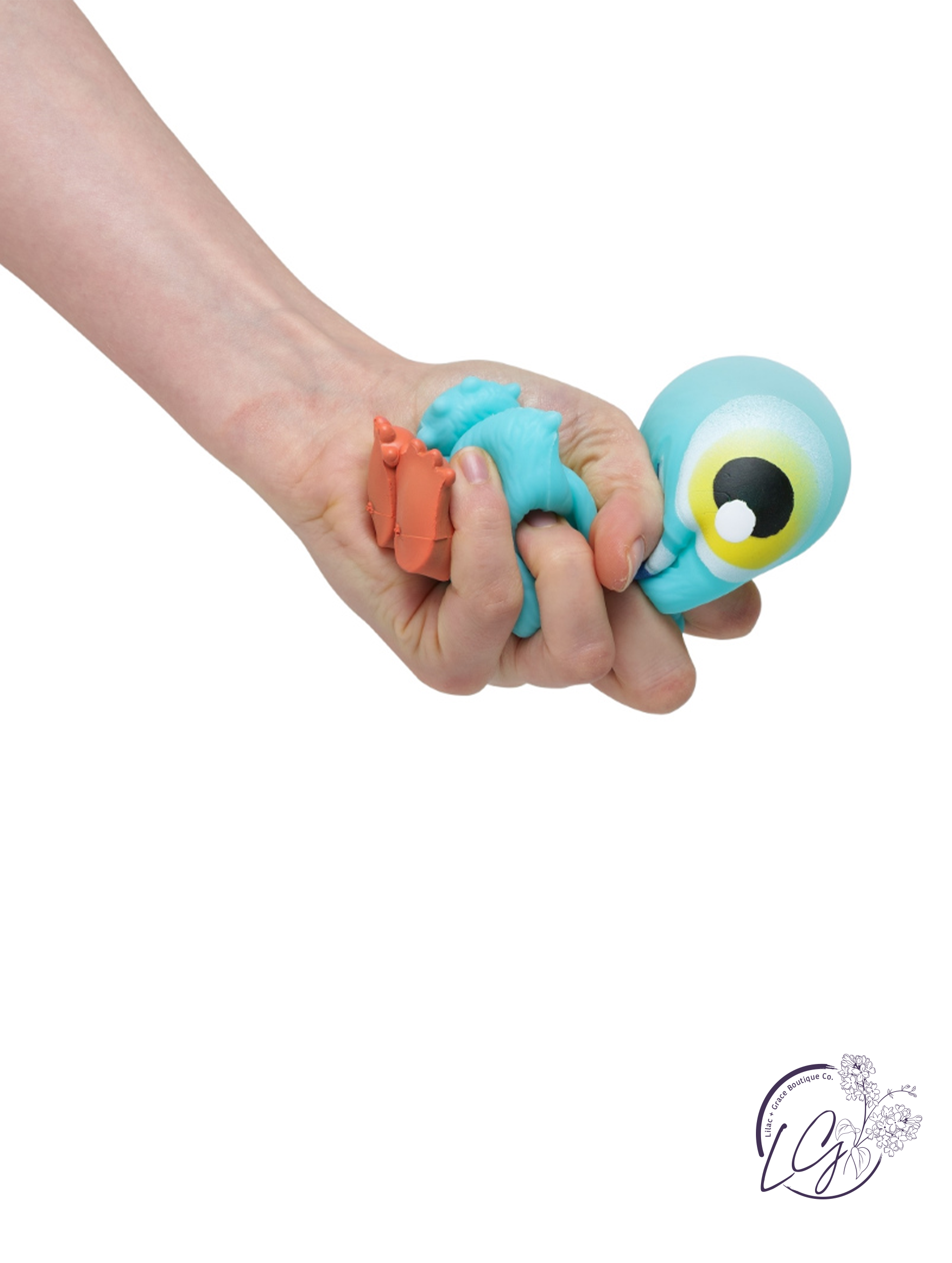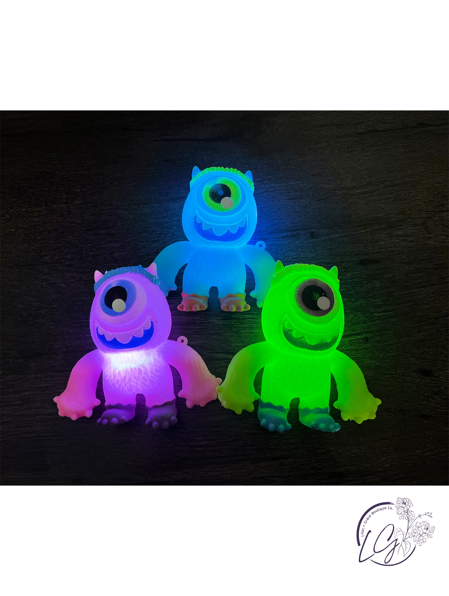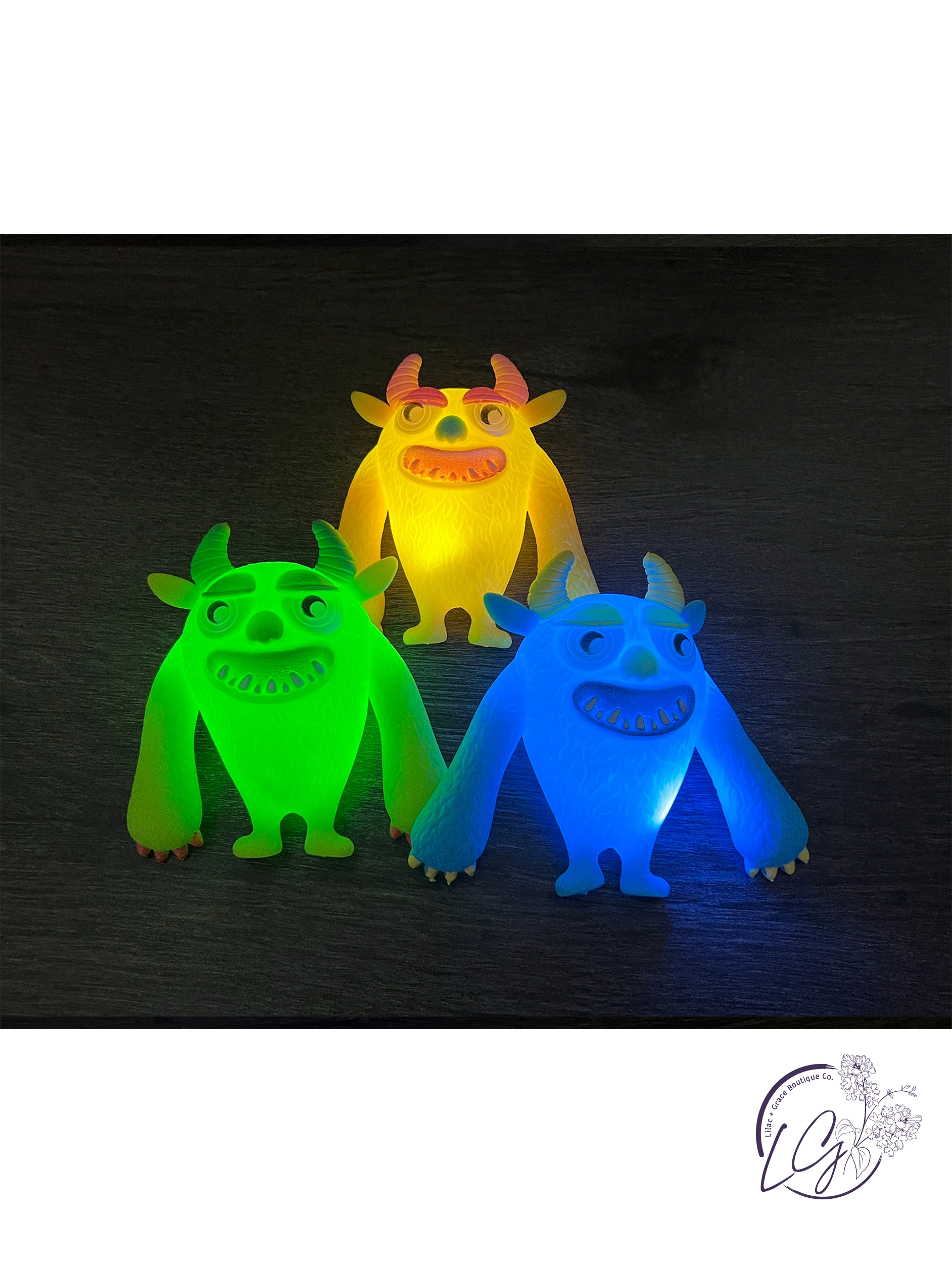 Squishy monster toy with light up features. Give this colourful creature a tap and its insides will light up, causing the cute critter to glow with a subtle warmth.