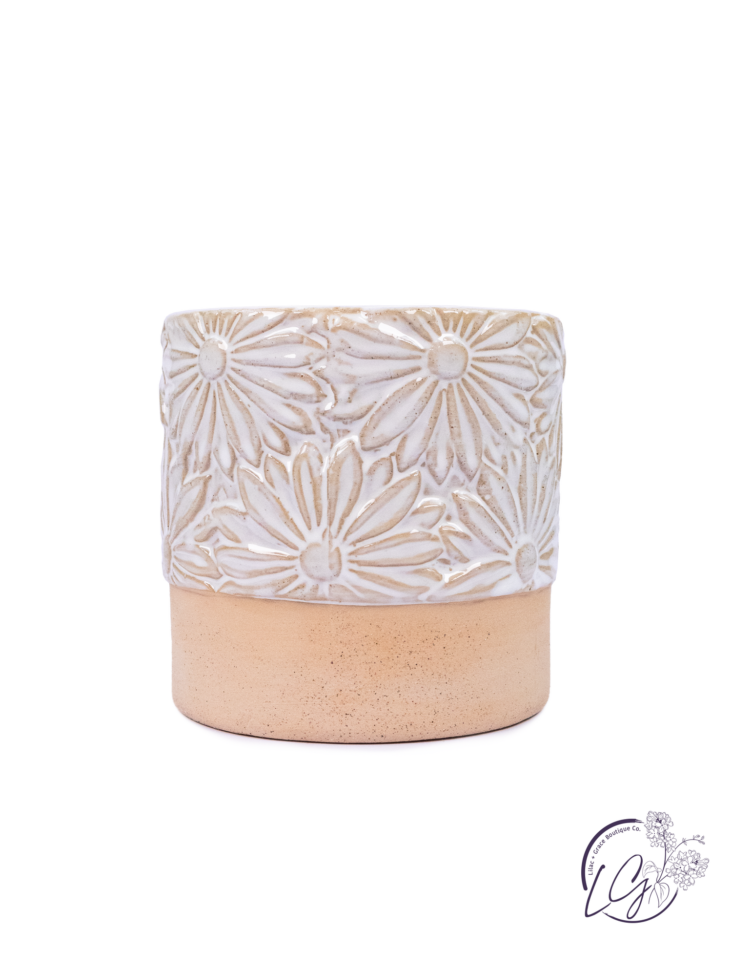 A Stoneware Daisy Planter is a charming addition to your garden or home decor. Crafted in soothing tan and white, this planter boasts a textured flower wrapping around its exterior.