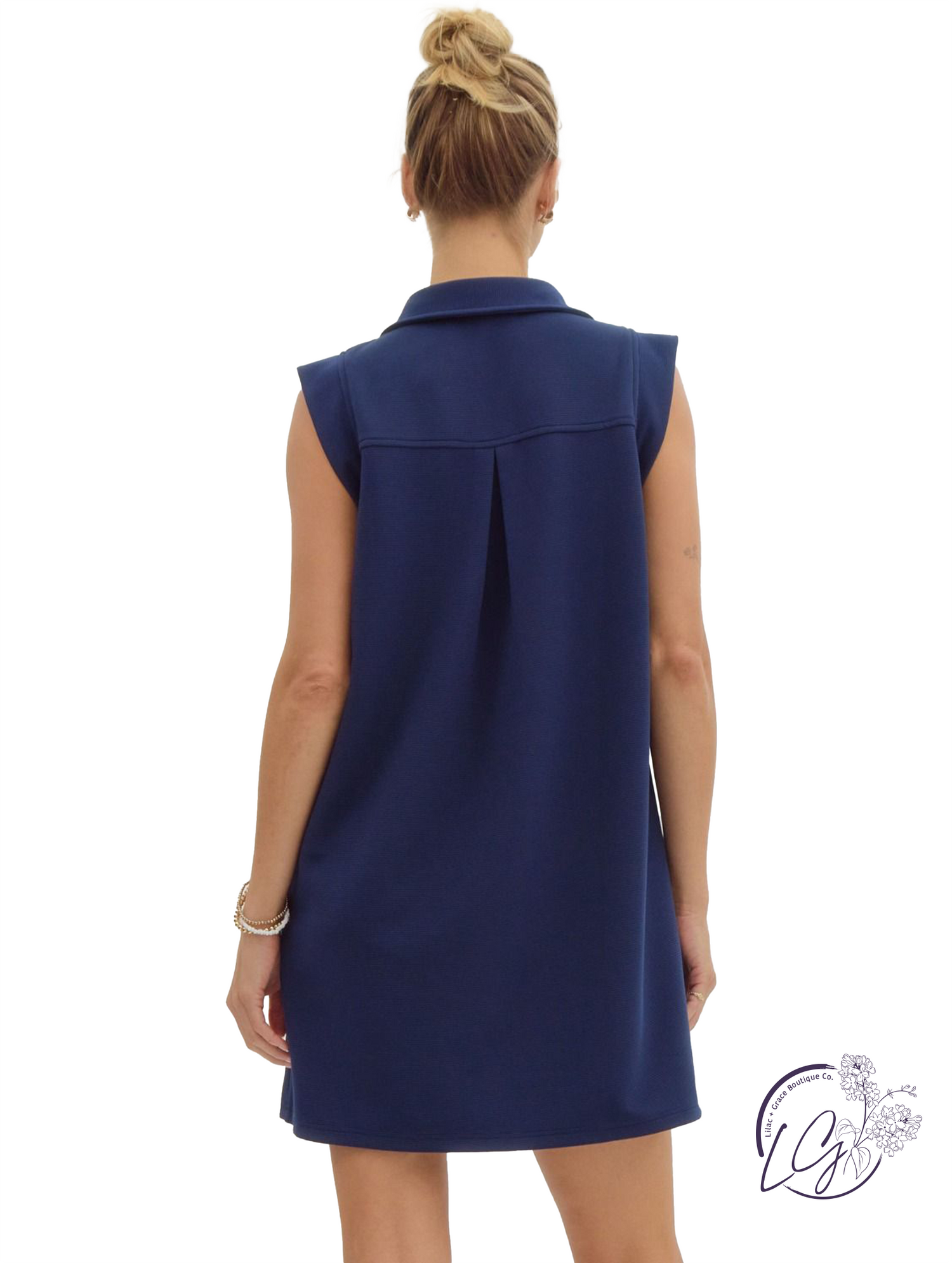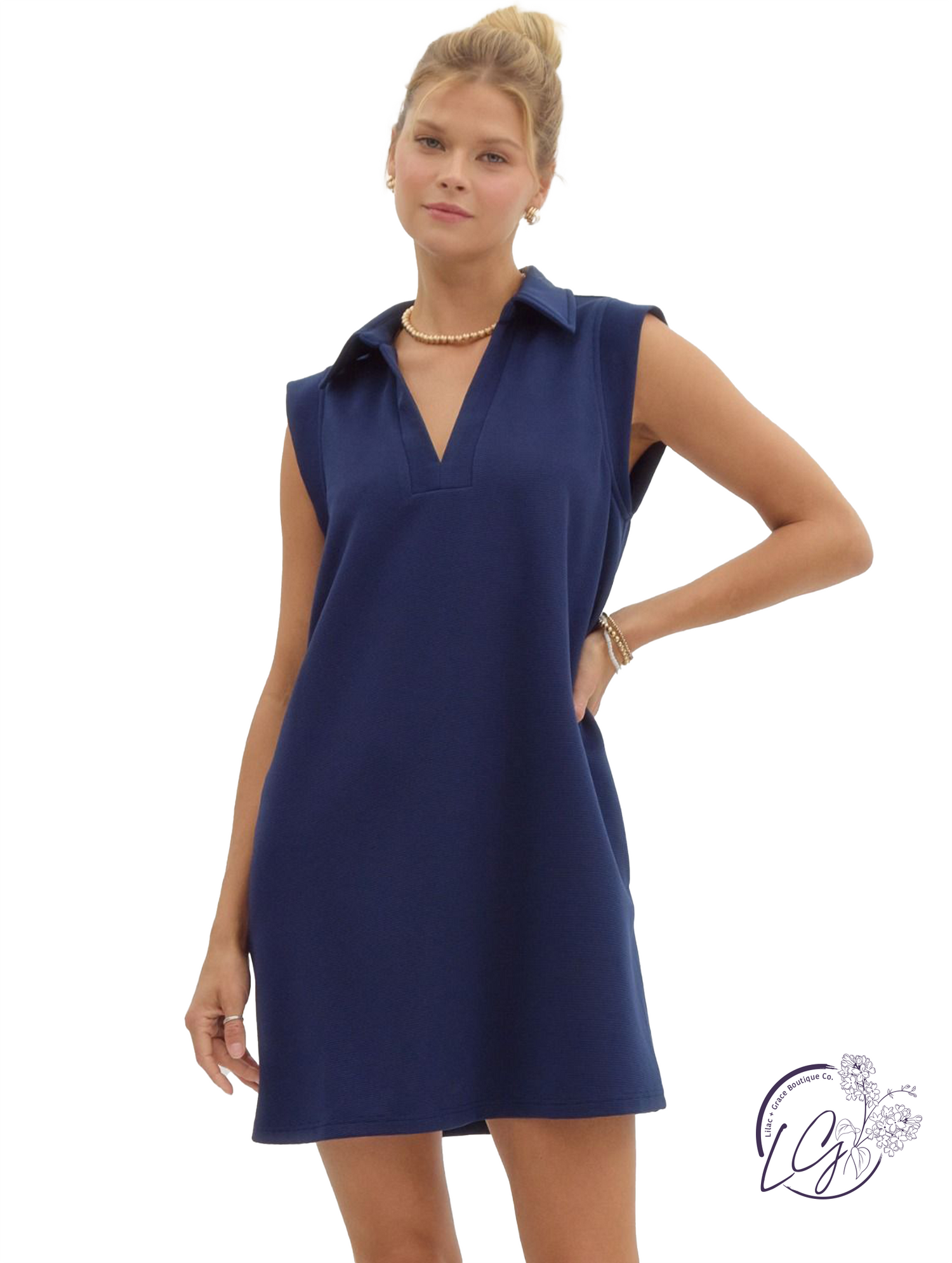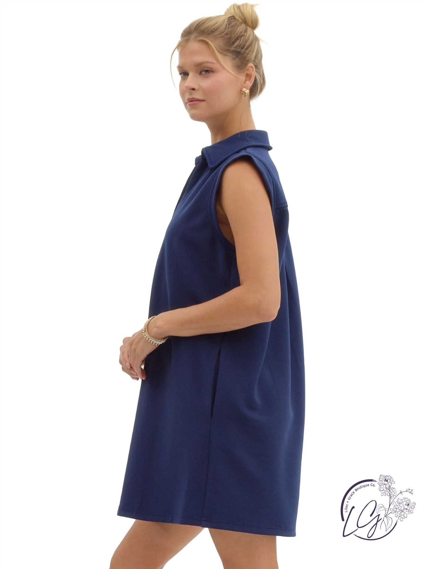 This textured solid mini dress features a collared V-neckline and a sleeveless design for a clean, structured look. Side pockets add everyday function, while the soft texture and relaxed fit make it perfect for warm-weather wear. Pair it with sneakers or sandals for an easy, polished outfit you can throw on and go.