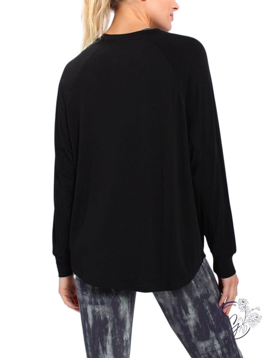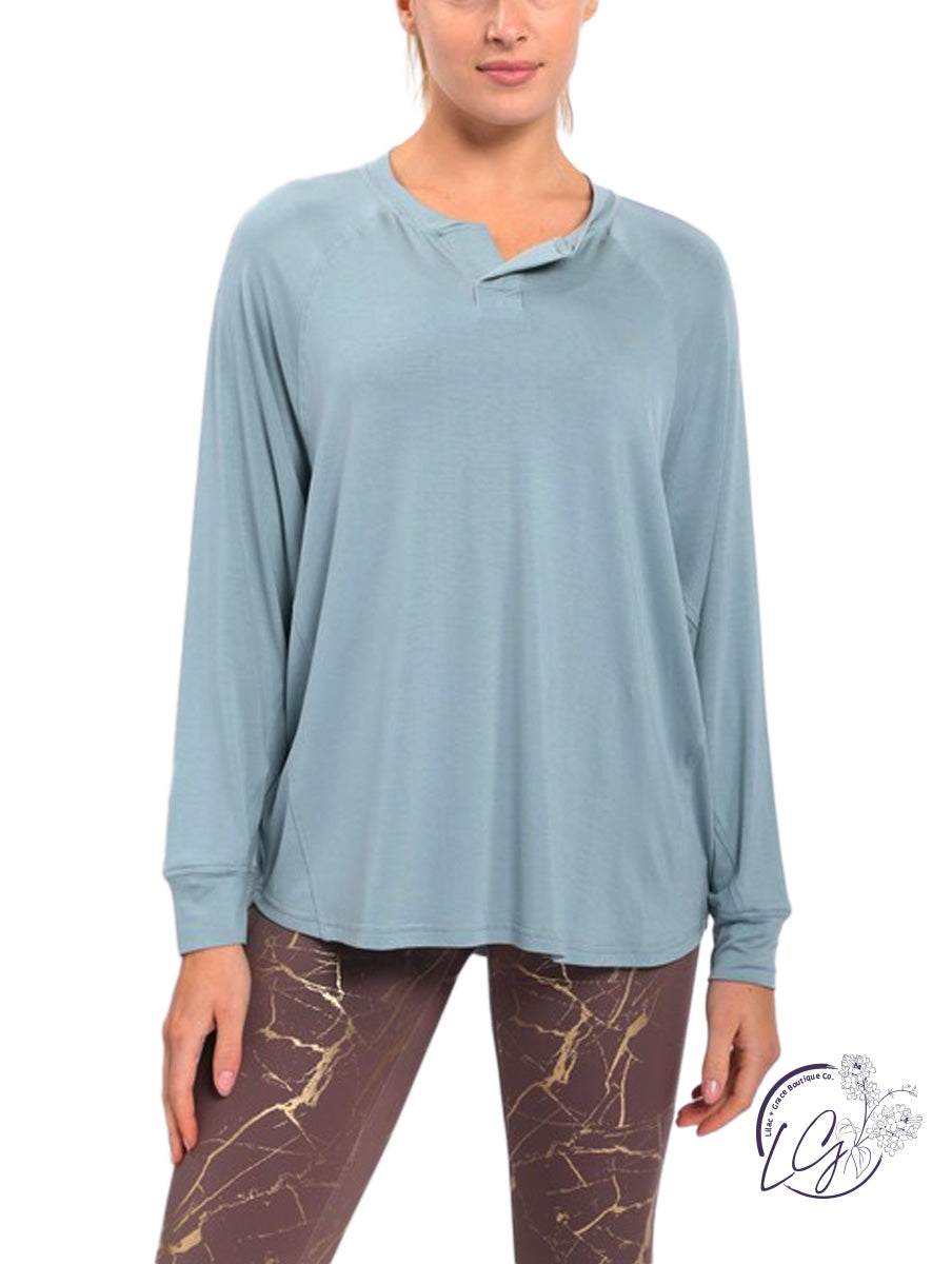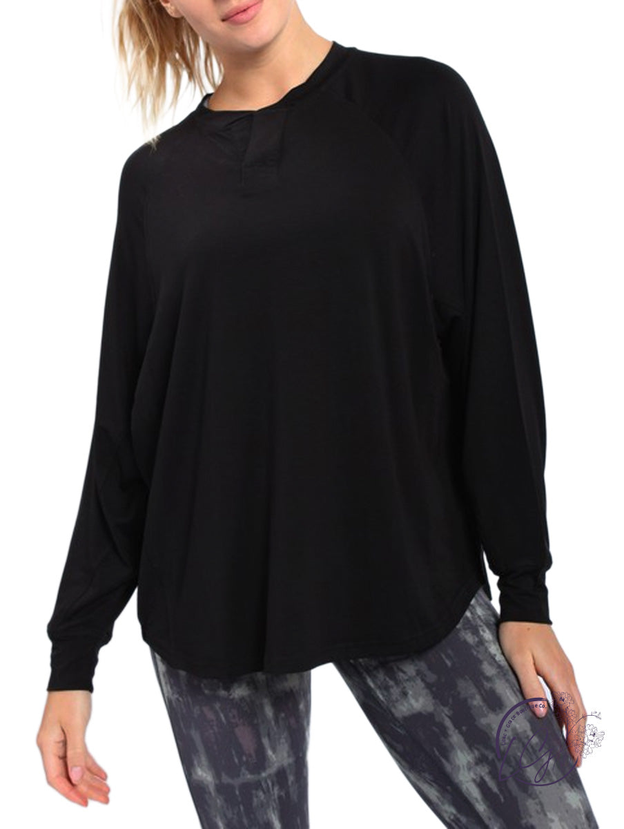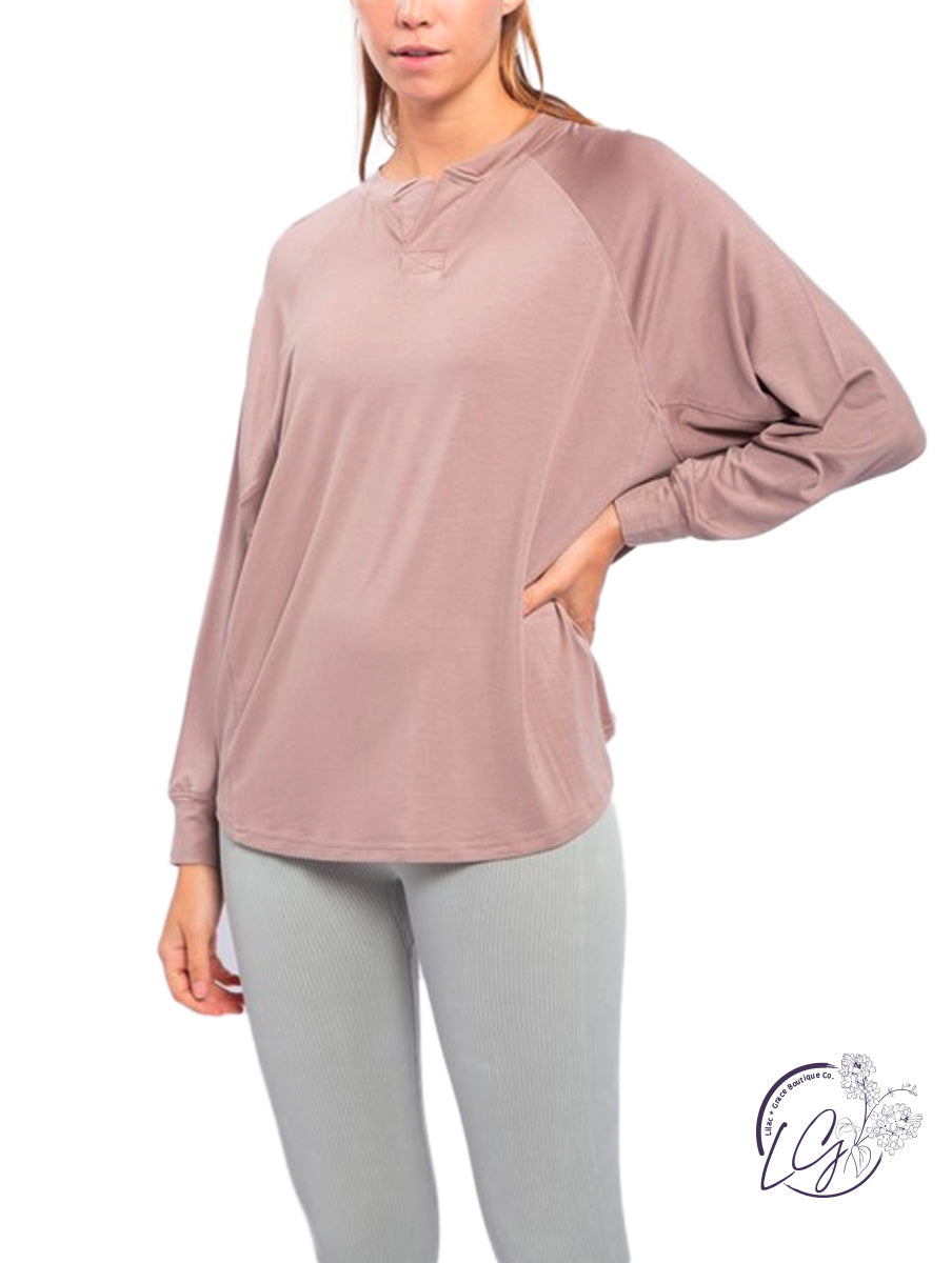 This long sleeve top has raglan seam-lines, a notched neckline, and side panels.