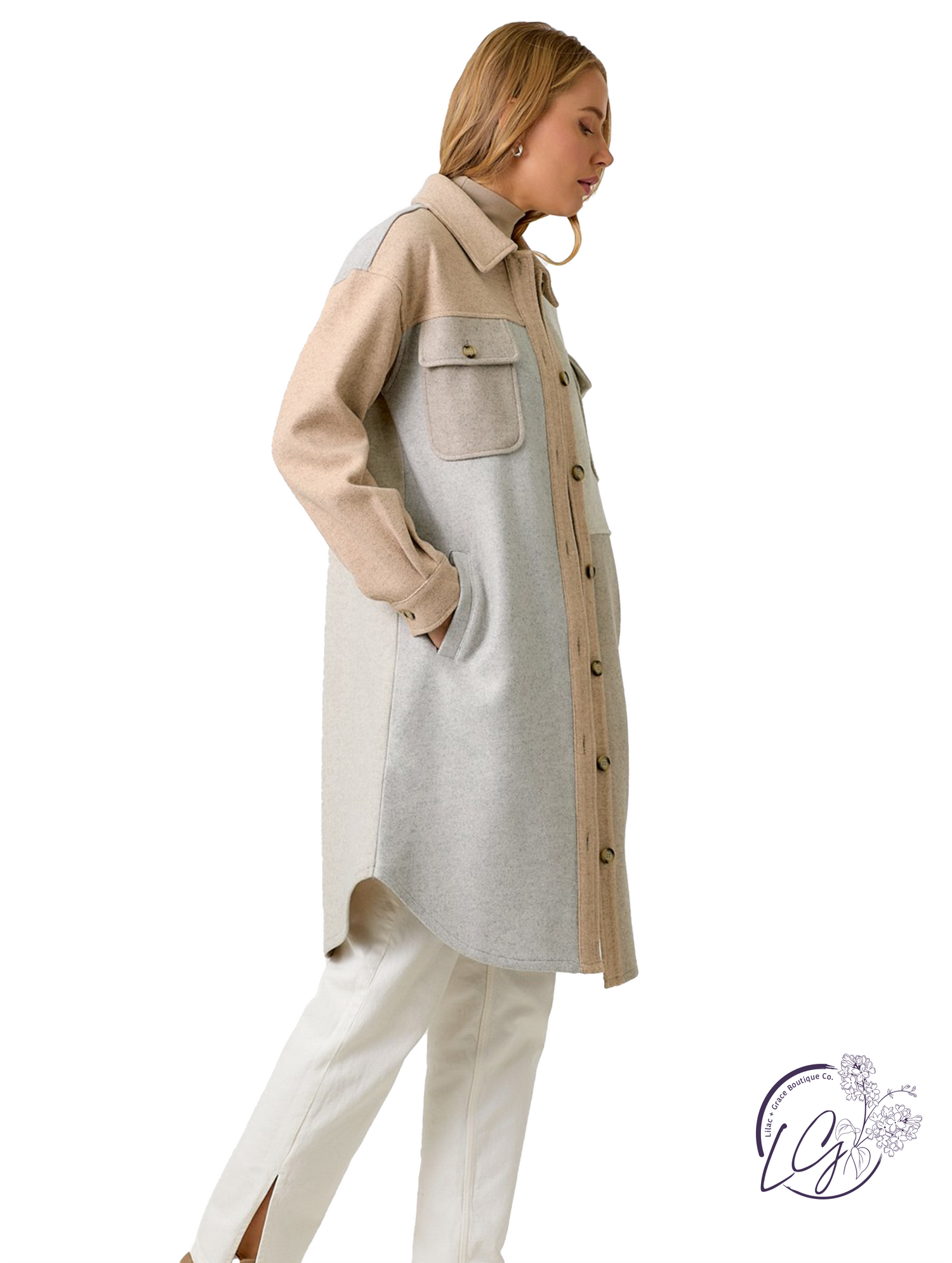 Meet your new layering essential — The Split Shacket is where color meets contrast in the most effortless way. Designed in a bold color block palette, this longline shacket merges the structure of a jacket with the laid-back comfort of a shirt. Crafted from soft, mid-weight fabric, it features a relaxed fit, button-front closure, and chest pockets for a utility-inspired edge. The statement color-blocking gives it a modern twist, making it the ultimate throw-on-and-go piece for transitional days.