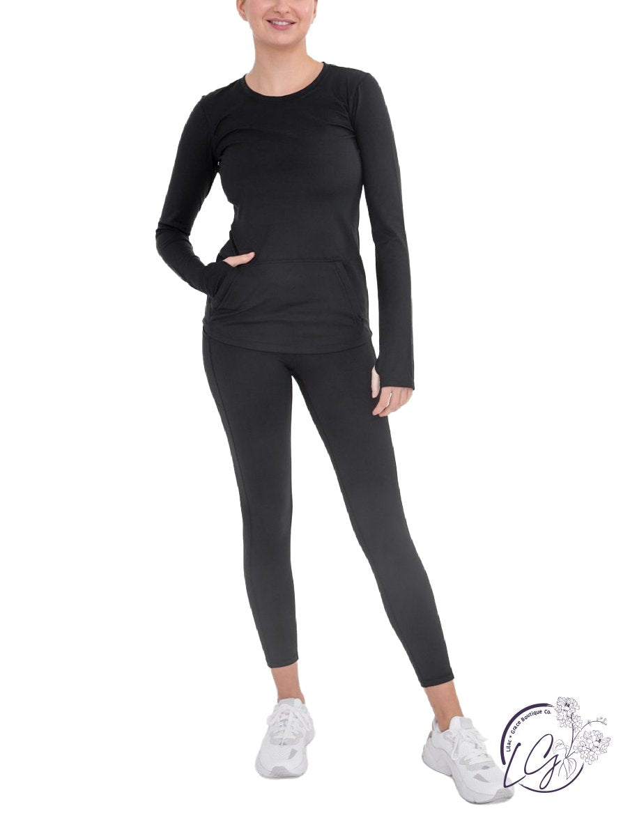 Designed with functionality in mind, the top features thumbholes for added coverage and a secure fit, allowing you to focus on your fitness routine without distractions. The sleek and versatile design seamlessly transitions from the gym to casual outings, making it an essential addition to your activewear wardrobe.