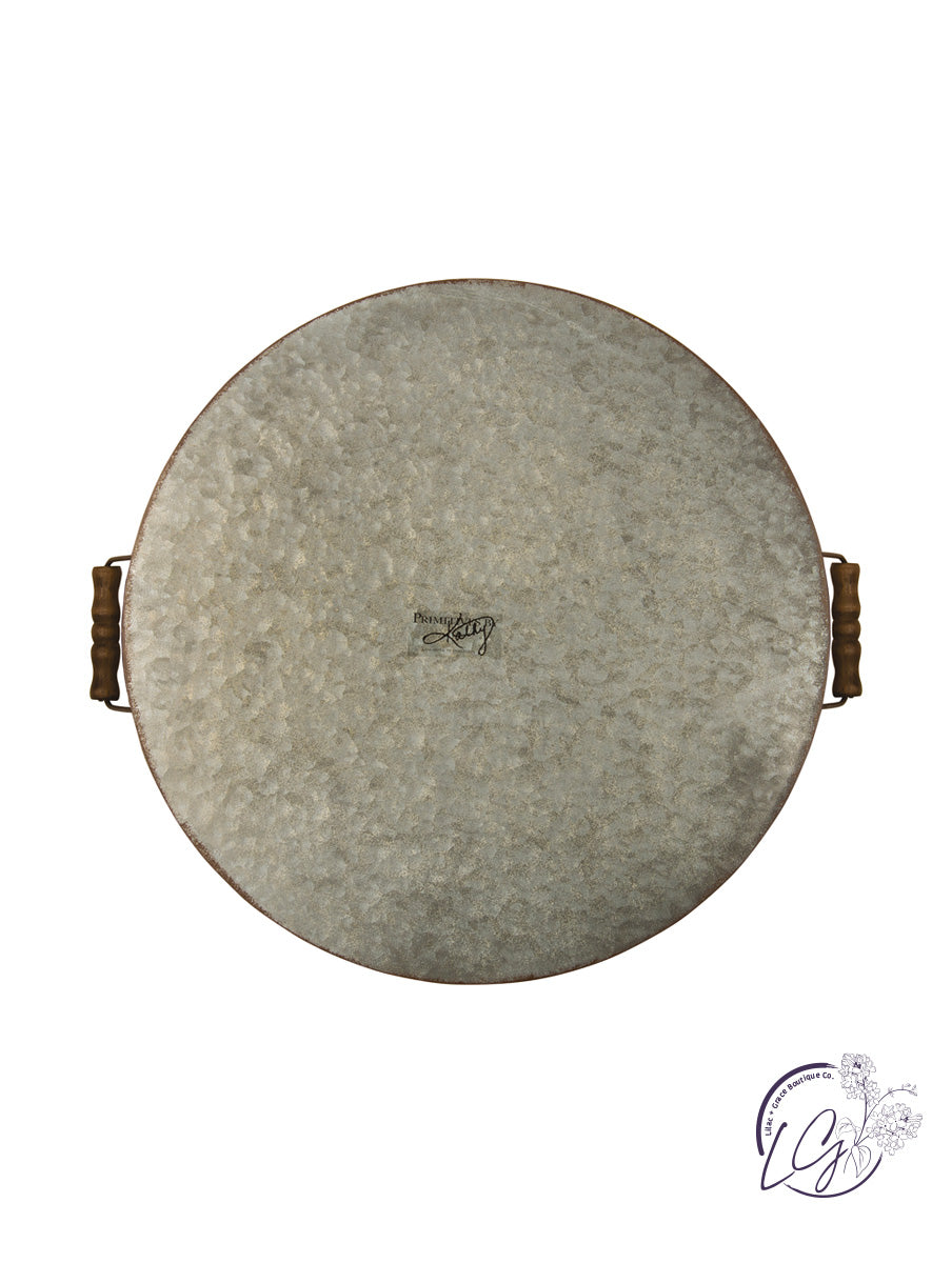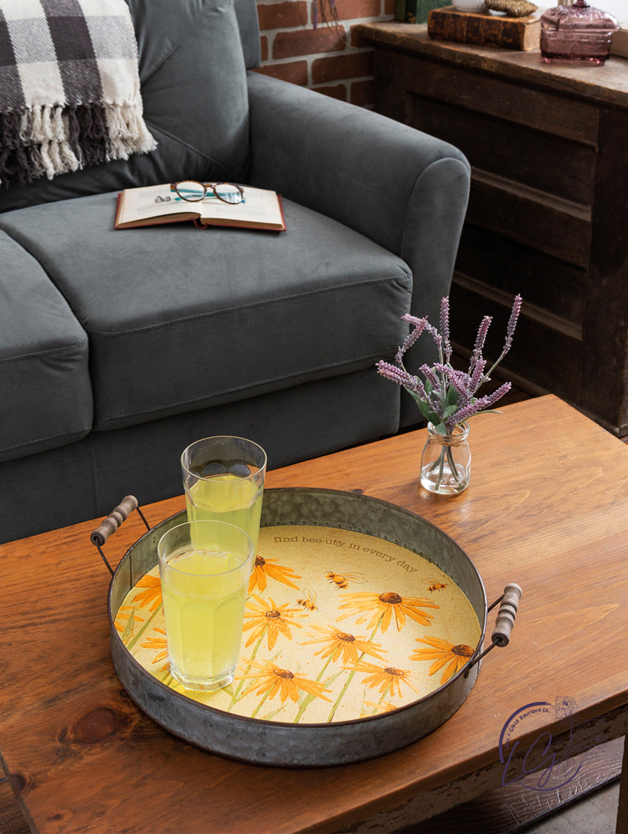 A galvanized metal tray featuring rustic flower and bee designs with "Find Bee-uty In Every Day" sentiment. Find Bee-uty In Every Day tray includes dual metal handles with wooden grips for easy carrying.