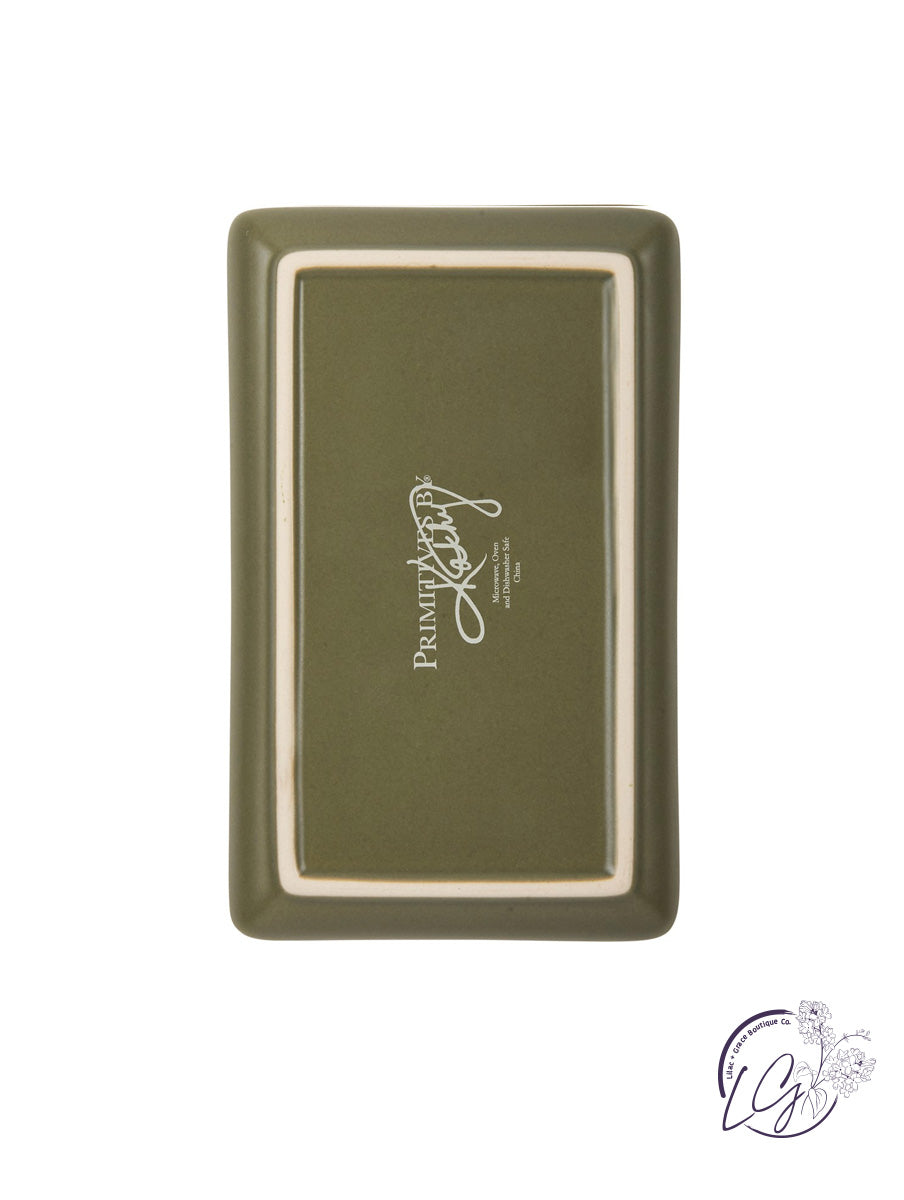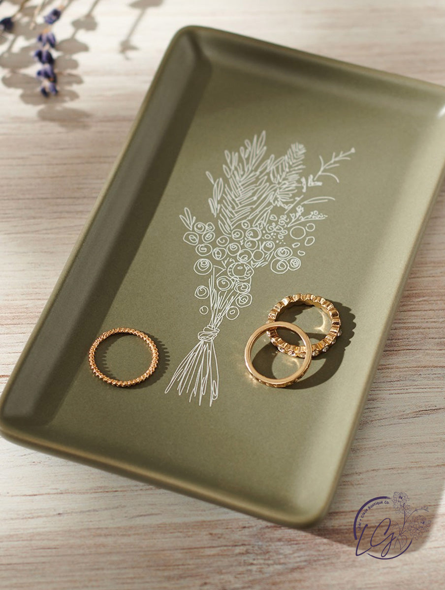 A stoneware vanity tray displaying a charming hand illustrated design of wildflowers. Tray features a comforting natural green color palette. The wildflower vanity tray is perfect for holding daily keepsakes.