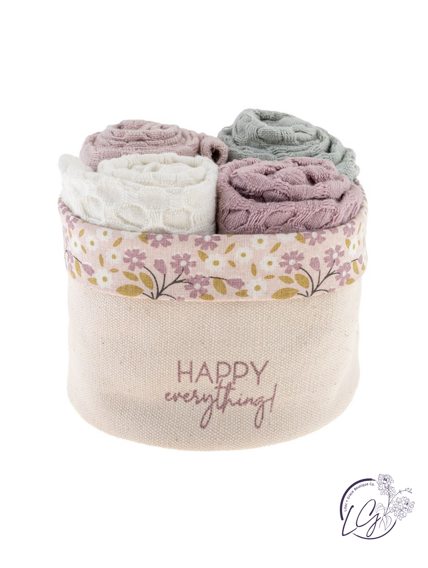 Cleaning and doing the dishes just got more fun and enjoyable with our precious waffle weave dishcloth sets. These dishcloths come in a color-coordinating set of four secured in a basket featuring a sweet saying. The dishcloths are machine washable and designed to remain durable even during tough scrubs. This set serves as the perfect organization tool for your kitchen or bathroom but can also be the perfect gift for a friend or loved one.