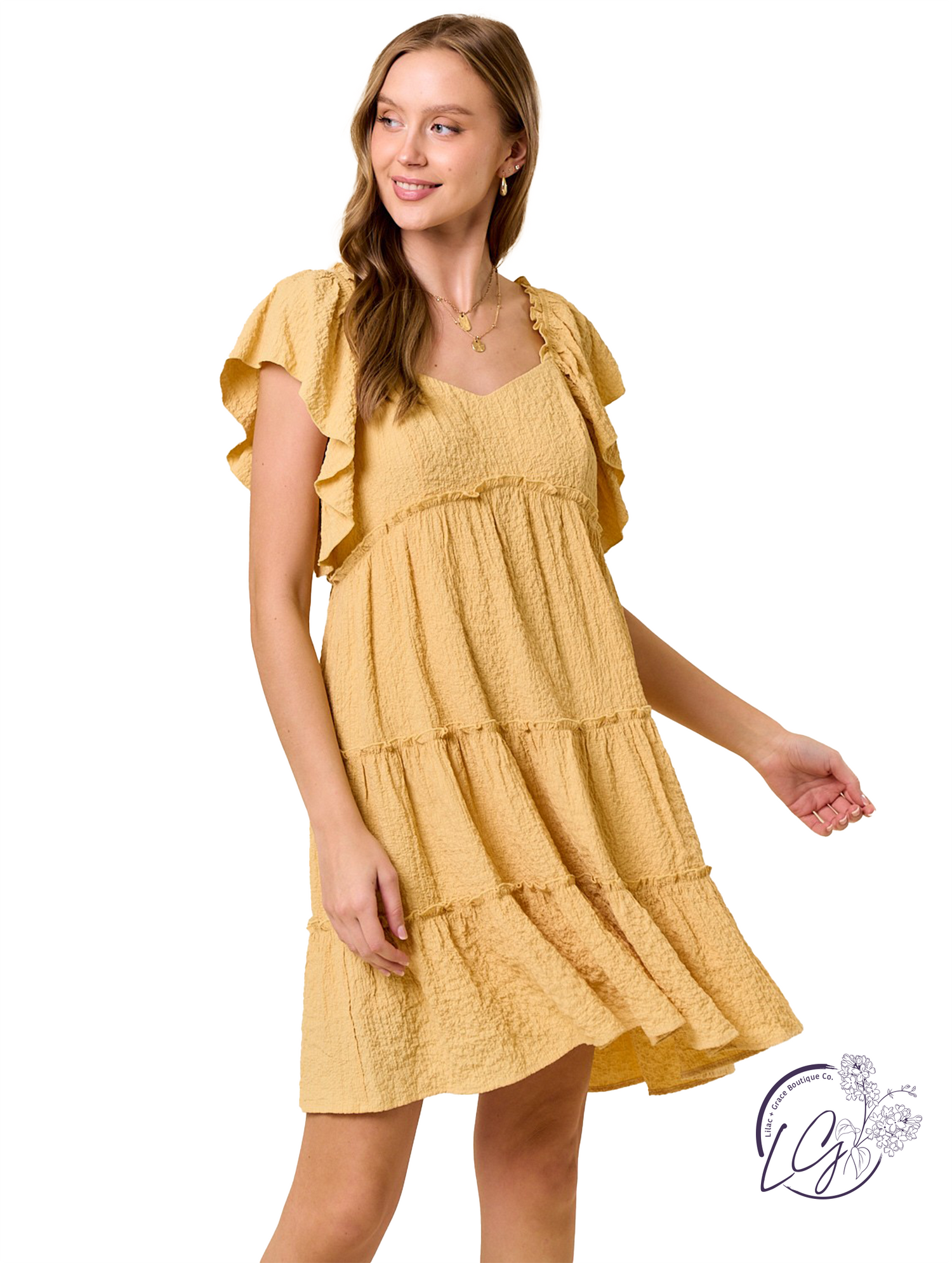 Soft and romantic, this babydoll woven dress is designed for effortless movement and charm. A flattering V-neckline is framed by delicate ruffle sleeves, adding a feminine touch to its breezy silhouette. The tiered skirt cascades in three airy layers, creating a flowy, graceful shape that moves beautifully with you. Crafted with a relaxed fit and an empire waistline, this dress offers all-day comfort without sacrificing style. Pair it with sandals for a sun-kissed daytime look or dress it up with statement jewelry and heels for an evening out.