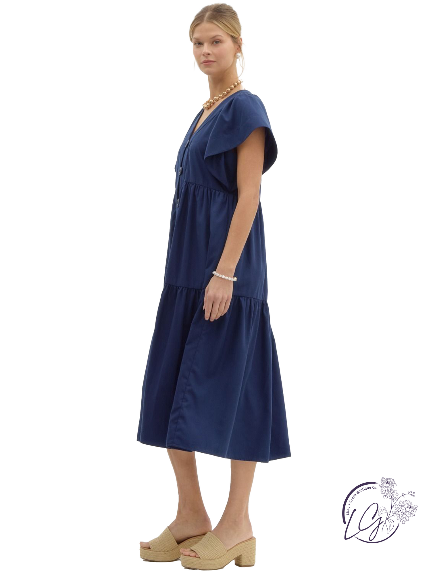 This solid tiered midi dress features a soft V-neckline and flutter sleeves for a light, airy silhouette. Oversized front buttons add bold detail to the flowing tiers, while the mid-length cut makes it perfect for warm days or casual gatherings. Pair it with sandals or flats for a breezy, laid-back look.