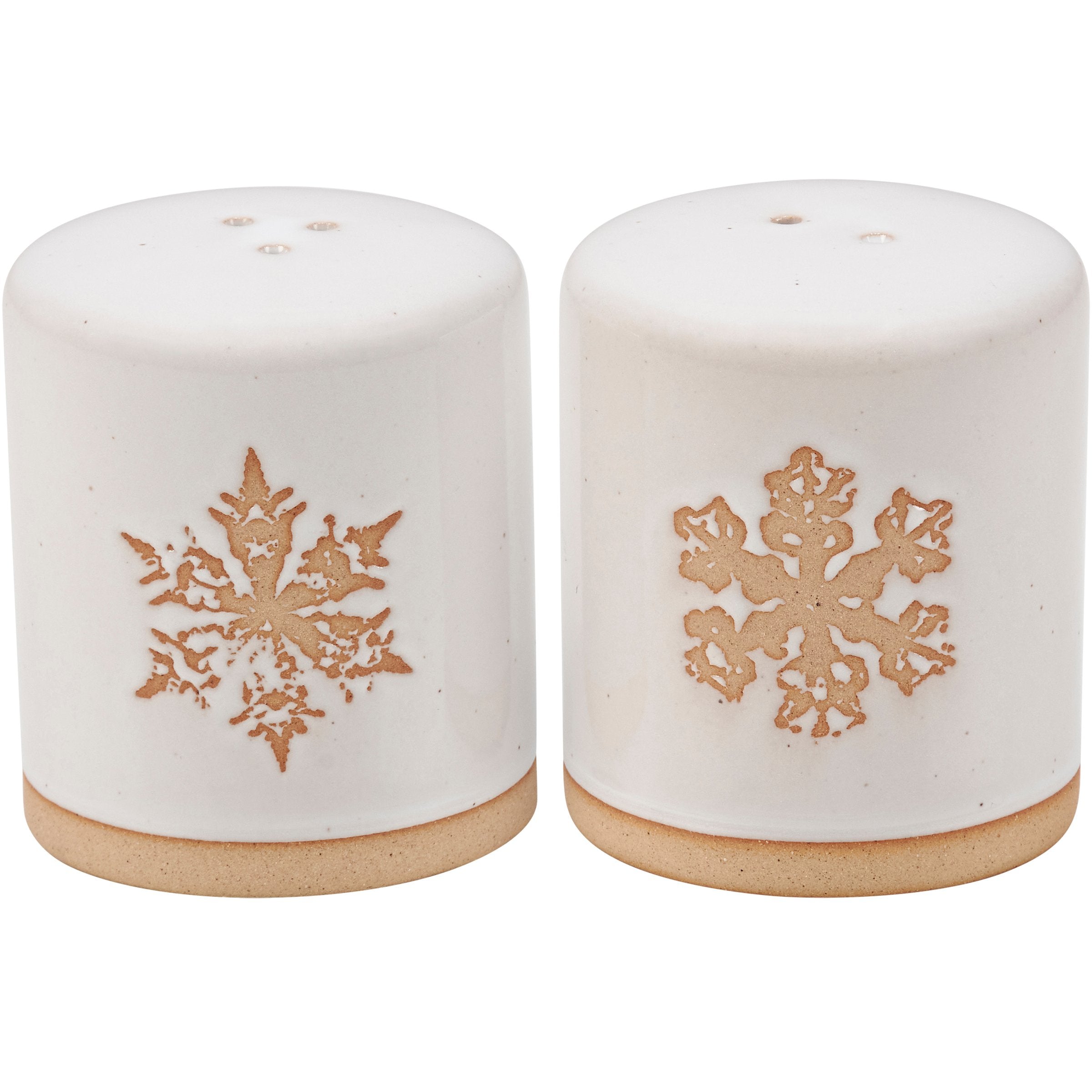 A snowy cream color with individual debossed snowflake designs and bare ceramic accents. Shakers include unique openings to tell them apart as well as plastic stoppers for easy refilling and cleaning. Our Winter salt and pepper shakers are microwave, dishwasher, and food safe for convenient use. A set of rustic tableware perfect for seasonal gatherings.