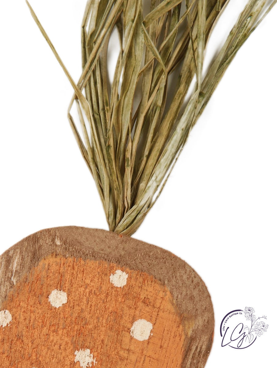 Decorative wooden carrots featuring varying sizes with individual dotted patterns and raffia grass as stems.