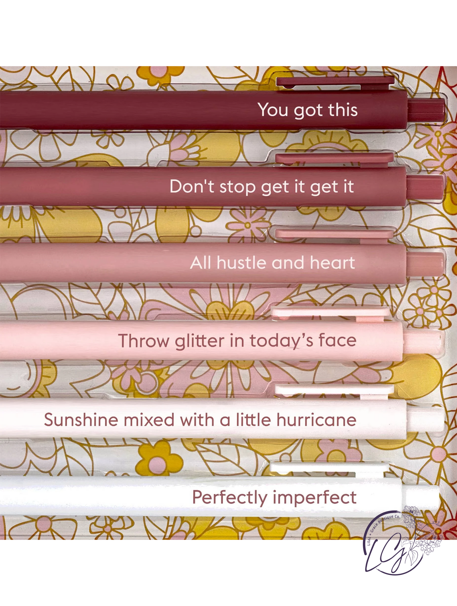 Set includes: You got this / Don't stop get it get it / All hustle and heart / Throw glitter in today's face / Sunshine mixed with a little hurricane / Perfectly imperfect Set of 6 pens Box - 6" x 8"