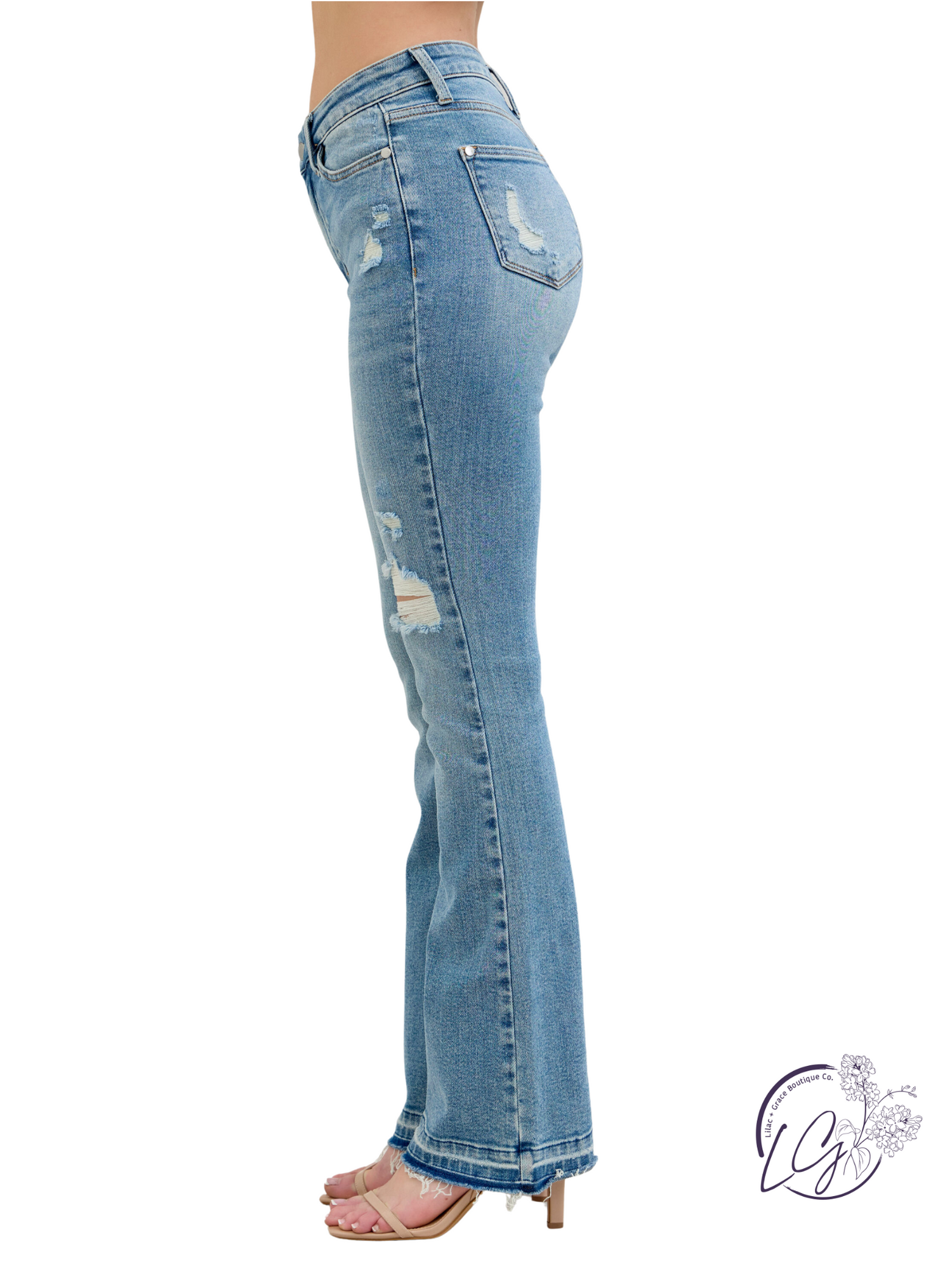 The Zara Mid-Rise Bootcut Distressed & Release Hem Jeans by Judy Blue offer a contemporary twist on classic denim. Designed with a flattering mid-rise waist for secure support and a bootcut leg that elongates your figure, these jeans balance retro charm with modern edge. Subtle distressing adds a lived-in vibe, while the release hem detail brings a raw, unfinished look. Crafted from a durable denim blend with just the right amount of stretch, they provide comfort and shape retention all day. Perfect for dressing up or down, pair them with a tailored blouse and heels or a casual tee and sneakers for a chic look.