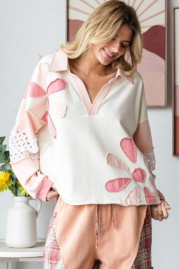 Fresh and fun, the Blue Skies Patchwork Pullover brings effortless retro charm to your everyday look. This lightweight top features soft blue tones, playful oversized floral appliqués, and eyelet lace accents for a touch of texture. The relaxed, slightly boxy fit and collared neckline make it easy to style — pair it with your favorite flares or comfy denim for that perfectly laid-back, boho vibe.