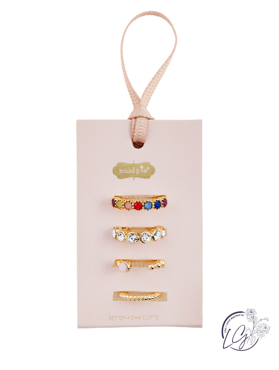 Set of four gold metal ear cuffs with pearl and pave stone details.