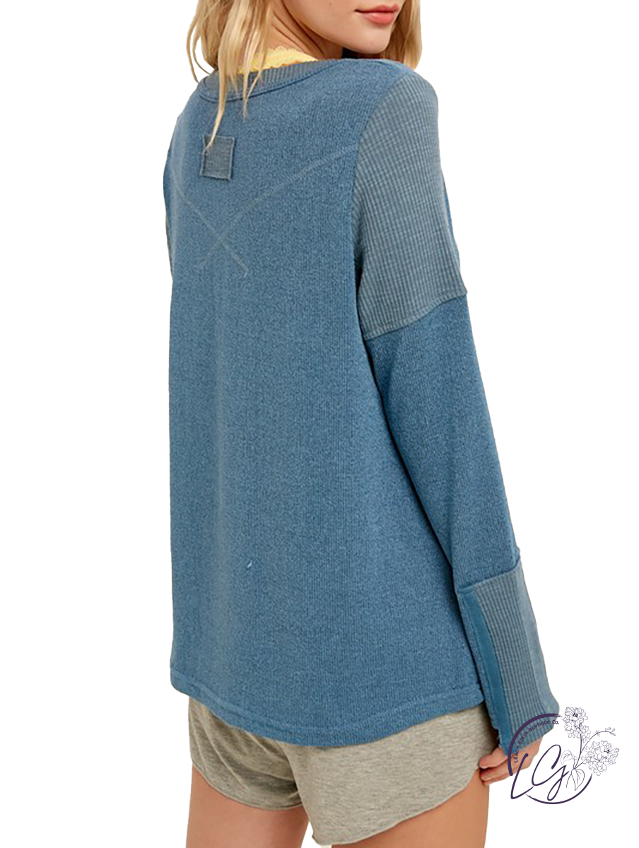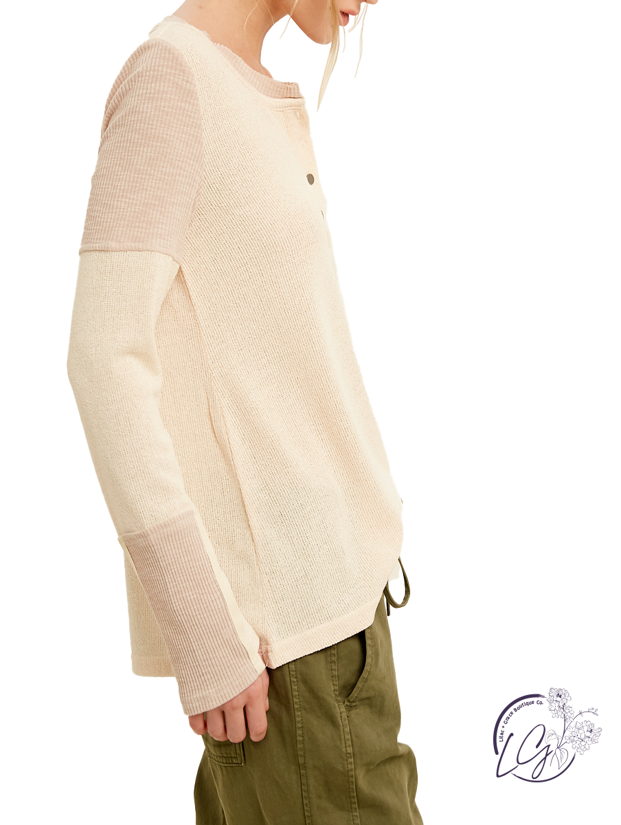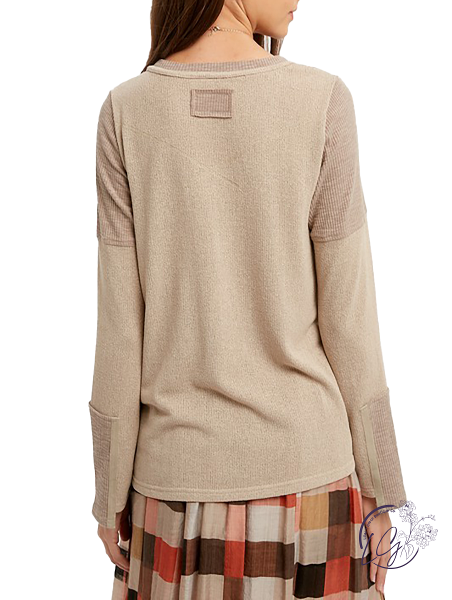 - Bottom hem with twill tape detailing sewn on top. -Contrast patch detail on top back neckline -finished with clean hem
