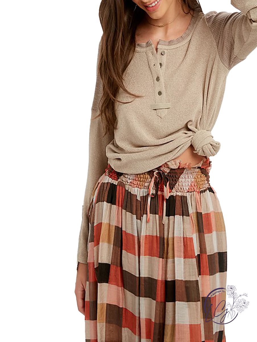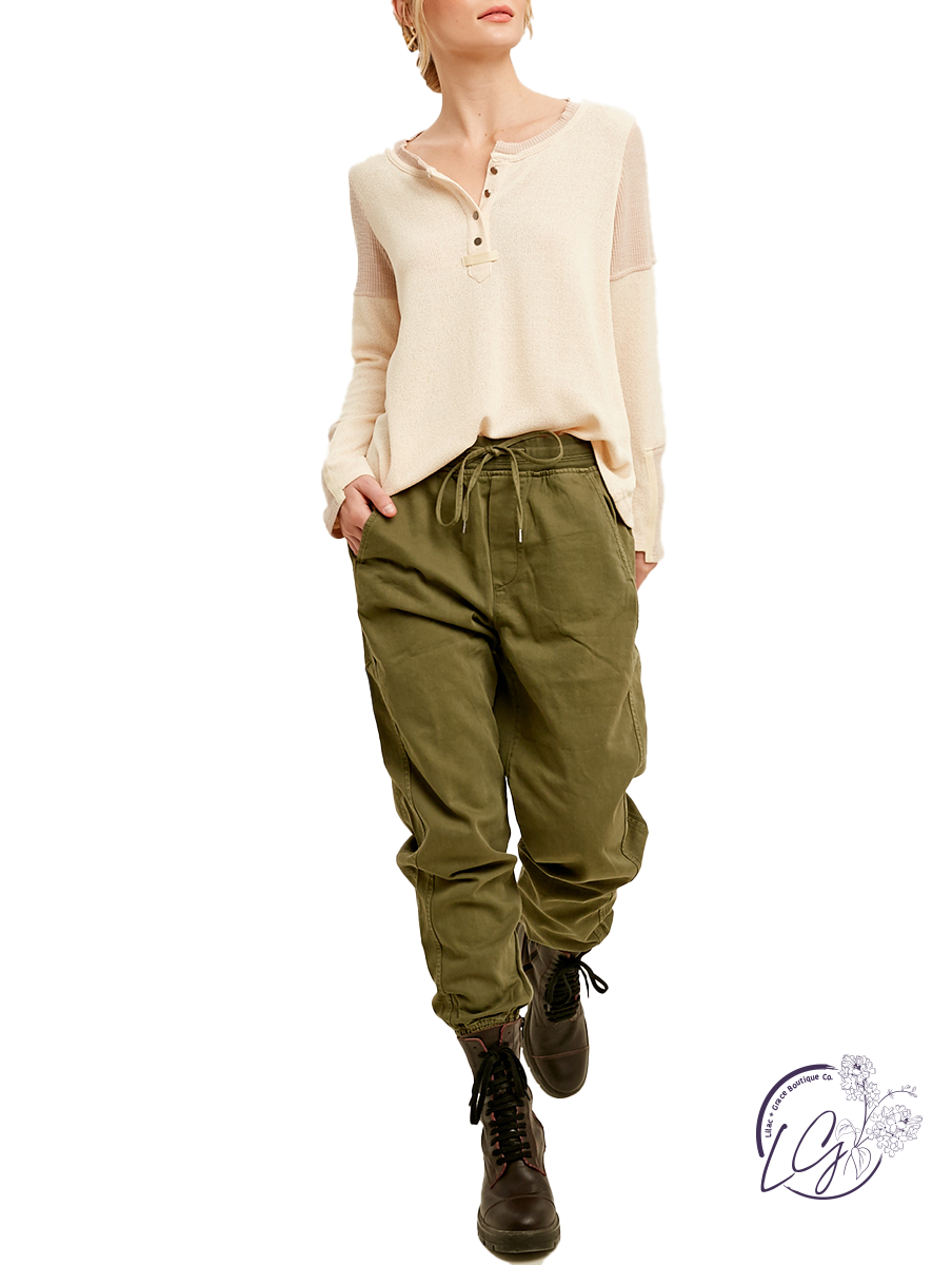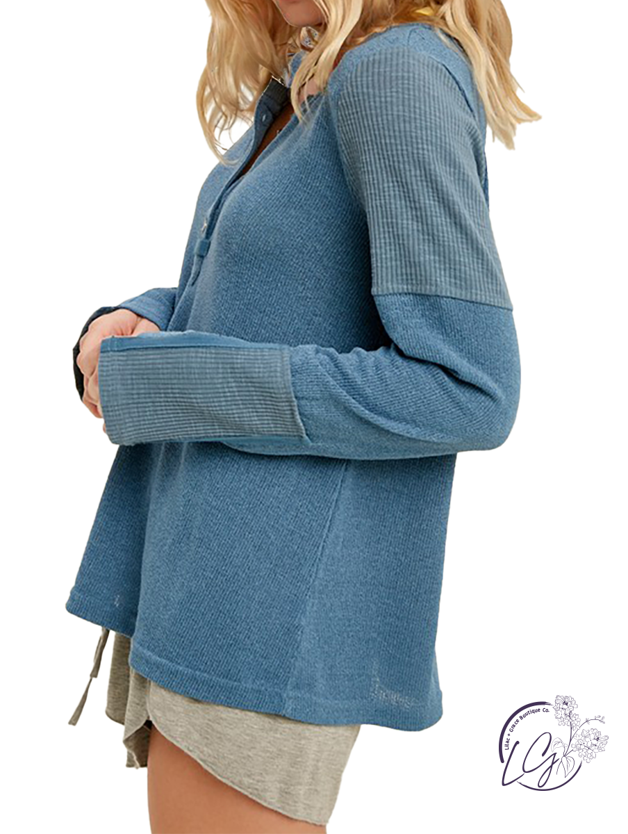- Bottom hem with twill tape detailing sewn on top. -Contrast patch detail on top back neckline -finished with clean hem