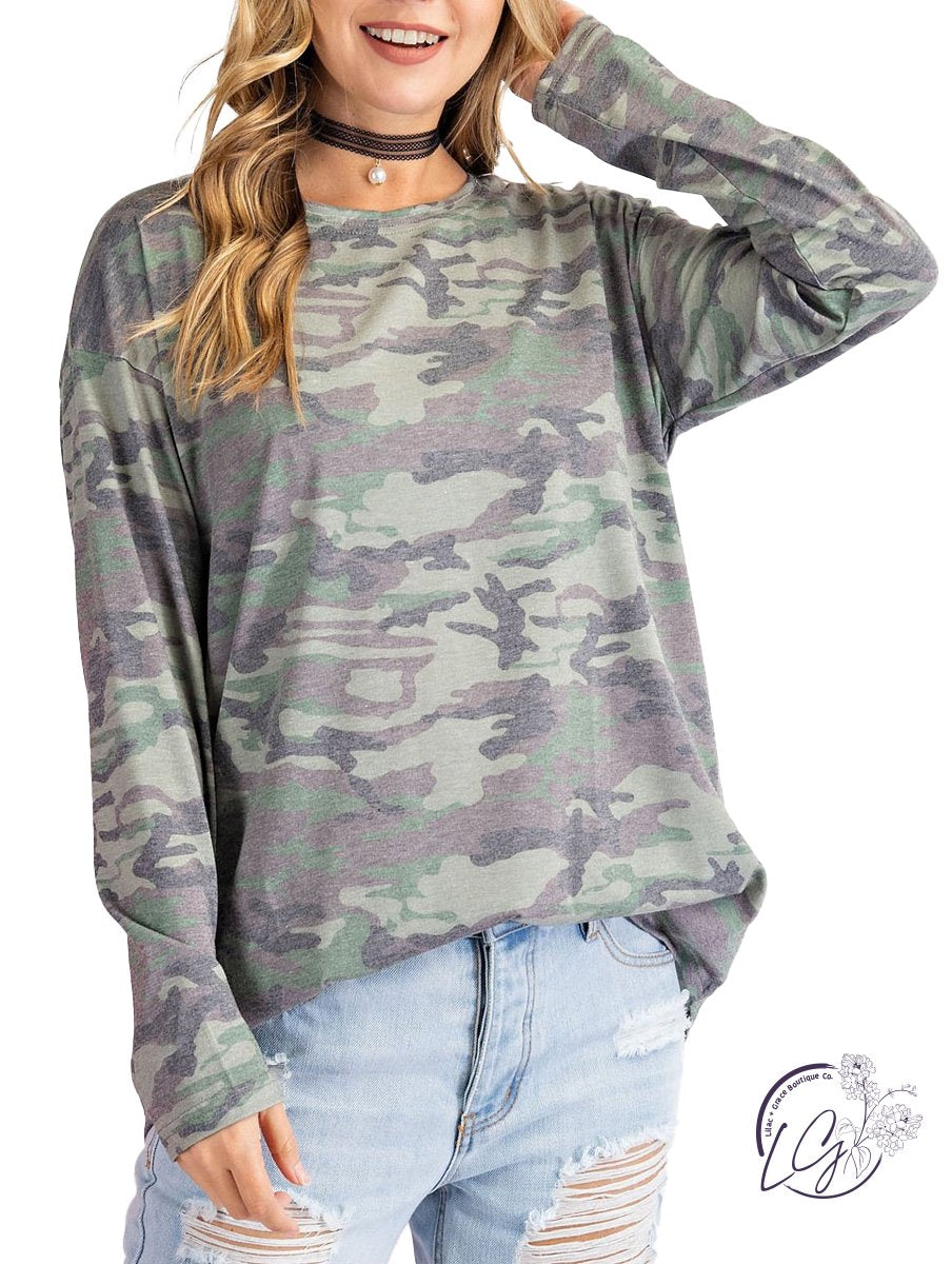 Butter Soft camouflage printed poly rayon knit top