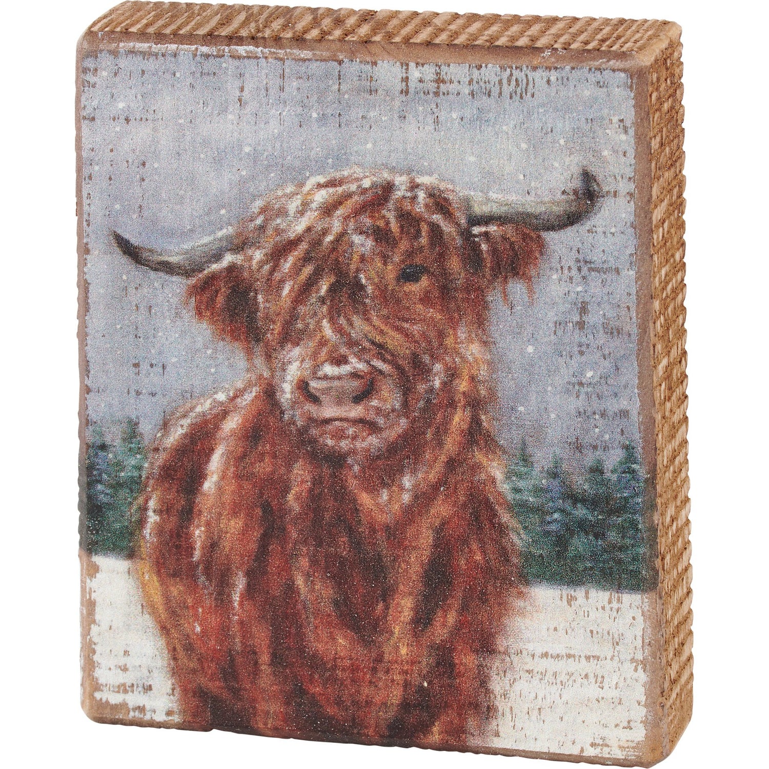 A wooden block sign displaying a calming hand painted scene of a highland cow in a snowy field. Design is replicated from original artwork painted onto burlap canvas, giving the art a unique depth and texture. Sides and back feature coordinating natural wood with distressed details. Our Snowy Highland block sign is easy to hang via predrilled keyhole slot or can free-stand alone. A charming seasonal home accent with a variety of display options.