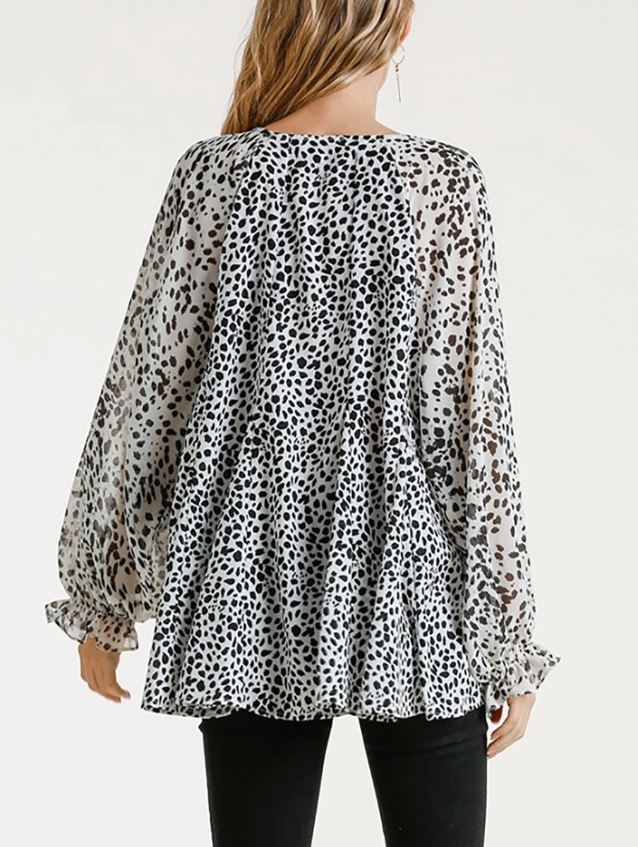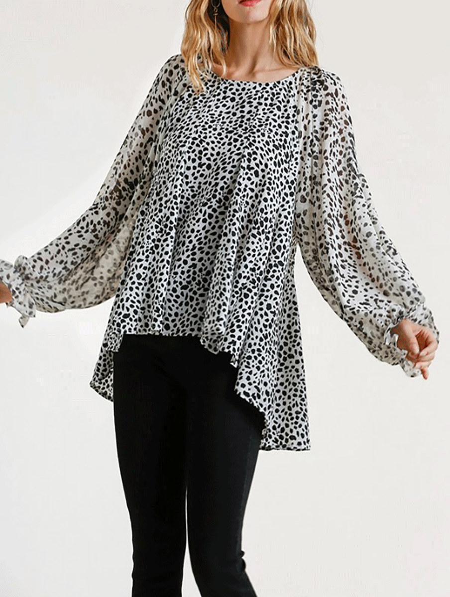 Contrast Dalmatian Print Balloon Ruffle Sleeve Top with High Low Hem